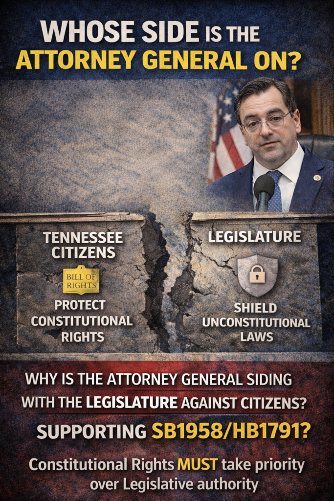Further, the question of who is pushing for the changes embodied in SB1958/HB1971 raises even broader questions for Tennesseans. Is it necessary that the state’s constitution be changed to require a publicly elected Attorney General whose first priority will be actually to enforce the constitutions when necessary against government violators?