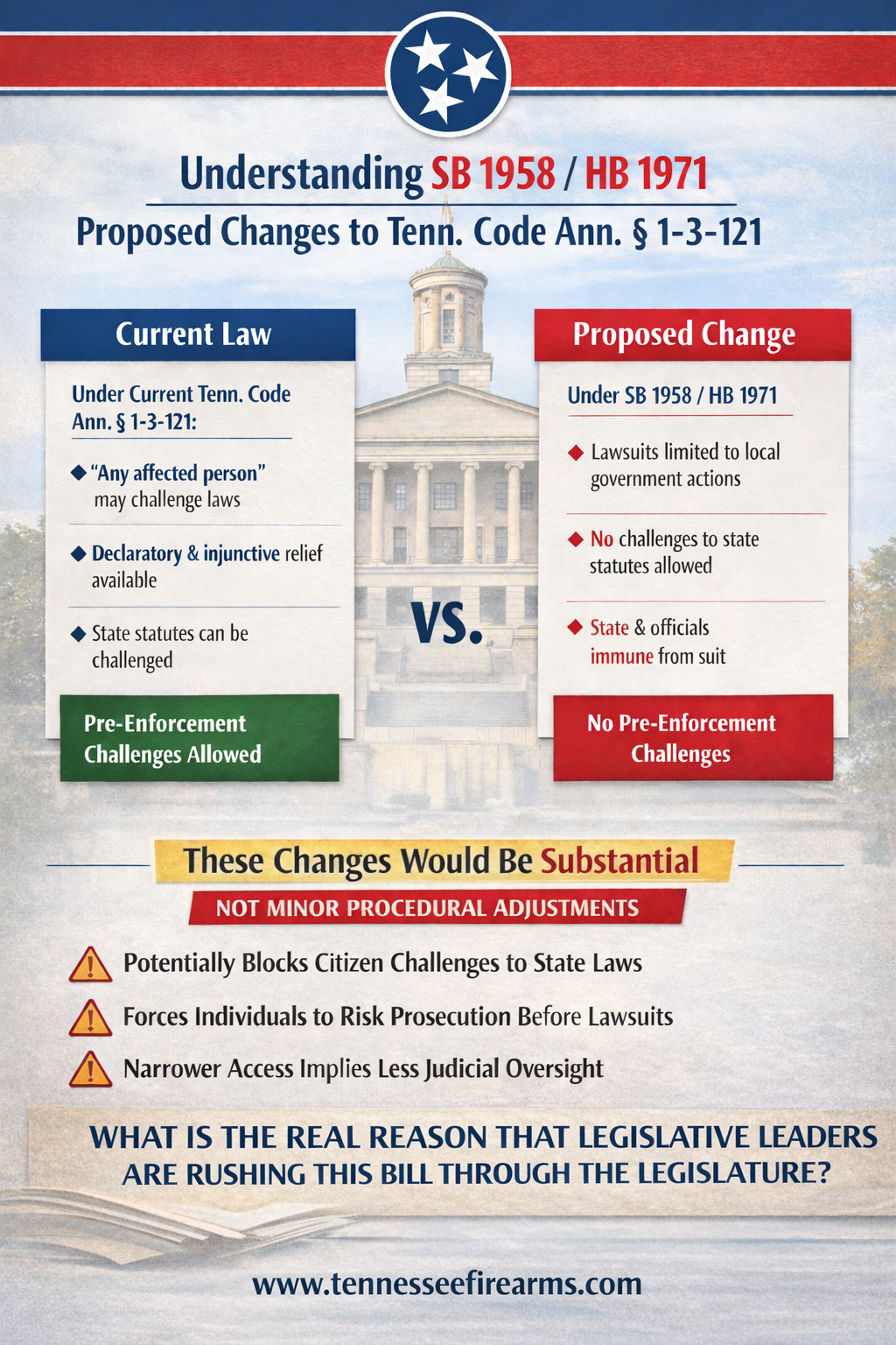 - How does the bill affect pre-enforcement review where citizens claim that a law bans (such as Tennessee’s numerous gun control statutes) or chills constitutionally protected conduct?