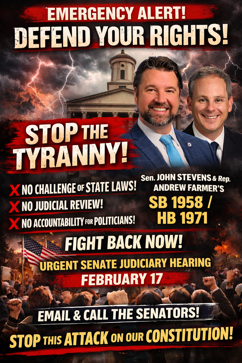 Tennessee State Senator John Stevens and House Member Andrew Farmer are pushing a bill that would gut the constitutional rights of citizens to challenge or even question the constitutionality of state statutes. They are pushing Senate Bill 1958 / House Bill 1971 on this issue.